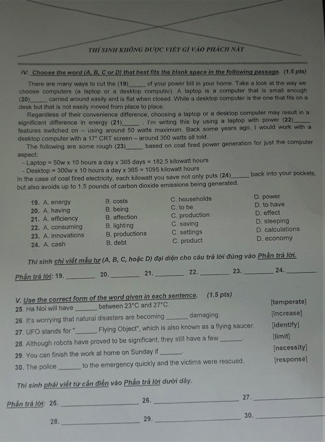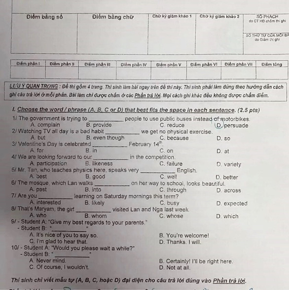 | Đề thi môn Tiếng Anh vào lớp 10 tại TP.HCM. Ảnh: Tuổi trẻ - Cập nhật lúc 20h01 |