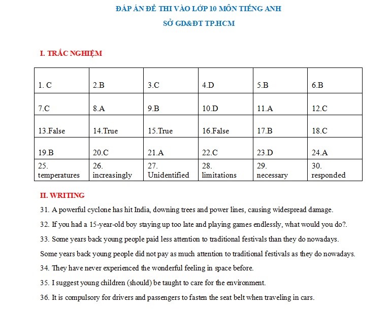 Đáp án gợi ý môn tiếng Anh vào lớp 10 tại TP.HCM. Nguồn: Học Mãi - Cập nhật lúc 20h05 ngày 16/7 |