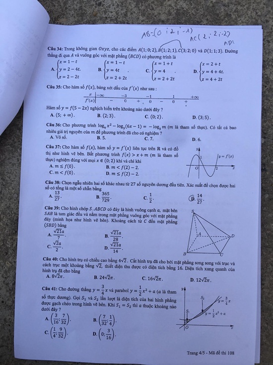 Đề thi môn Toán mã đề 108 THPT quốc gia 2019 (Đáp án trong đề thi là của thí sinh dự thi):