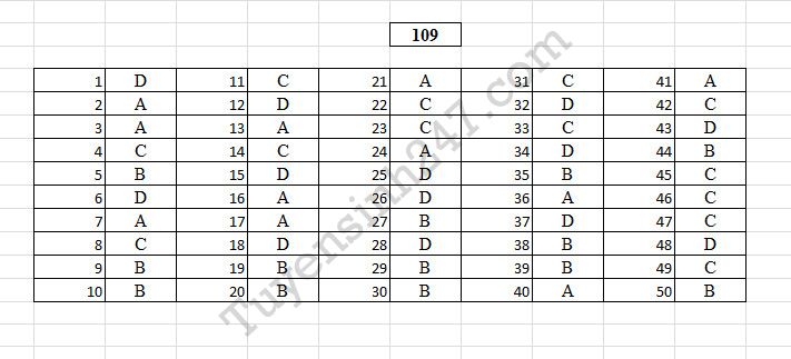 Đáp án mã đề toán 109 - Nguồn: Hoc24h.vn. |