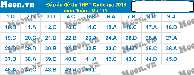 Gợi ý đáp án đề thi THPT Quốc gia môn Toán 2018 - Mã đề 111 - Ảnh: Moon.vn |