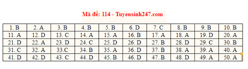 Đáp án tham khảo môn Toán mã đề 114 THPT quốc gia 2019. Nguồn: Tuyensinh247.com |