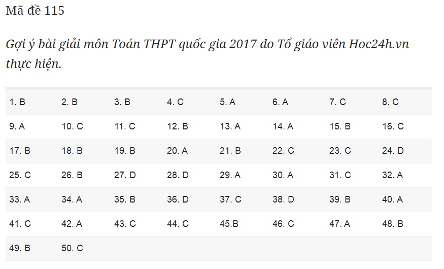 Đáp án gợi ý môn Toán mã đề 115 THPT quốc gia 2017. Nguồn: Hoc24h.vn. |