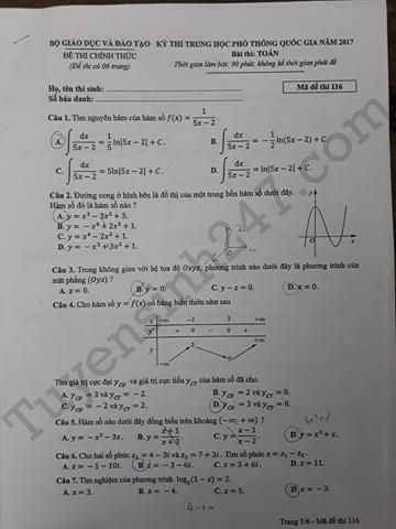 Đề thi môn Toán mã đề 116 THPT quốc gia 2017. Nguồn: Tuyensinh247 |
