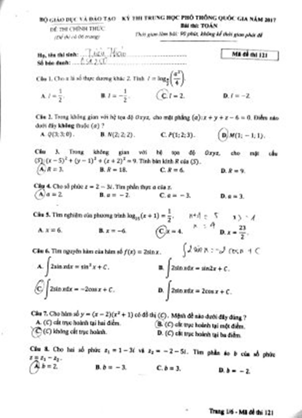 Đáp án đề thi THPT quốc gia 2017 môn Toán mã đề 121. Trang đời sống & Pháp luật sẽ cập nhật nhanh nhất đáp án chính thức môn Toán của Bộ GD-ĐT.
