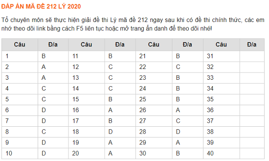 Đáp án gợi ý môn Vật lý mã đề 212 tốt nghiệp THPT 2020. Ảnh: Đoctailieu.com |