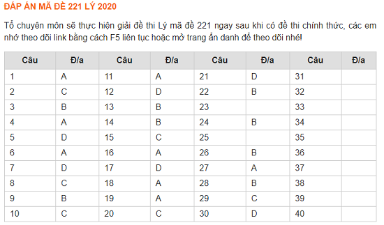 Đáp án gợi ý môn Vật lý mã đề 221 tốt nghiệp THPT 2020. Ảnh: Doctailieu.com |