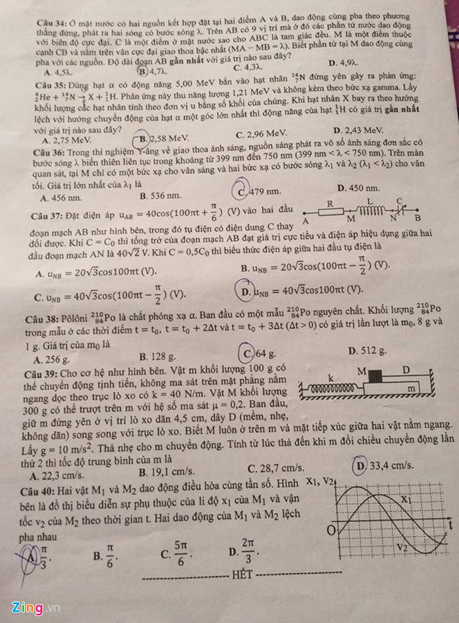 Tham khảo gợi ý đáp án đề thi Vật lý mã đề 206 THPT quốc gia 2018 - Ảnh: Zing. |