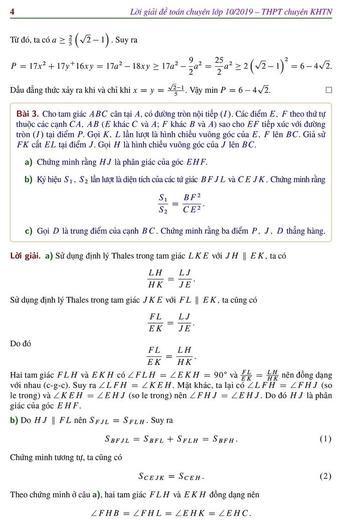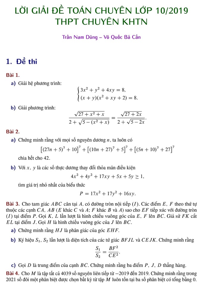 Đáp án đề thi chuyên Toán trường Khoa học Tự nhiên năm 2019 do TS Trần Nam Dũng (Phó hiệu trưởng trường Phổ thông Năng khiếu, ĐH Quốc gia TP HCM) và thầy Võ Quốc Bá Cẩn (trường THCS Archimedes, Hà Nội) giải.