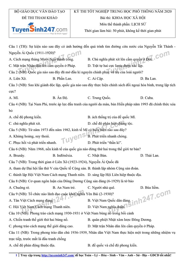 Bộ giáo dục vừa công bố đề thi tham khảo kỳ thi tốt nghiệp THPT 2020. Dưới đây là chi tiết đáp án gợi ý môn Lịch sử kỳ thi tốt nghiệp THPT 2020.