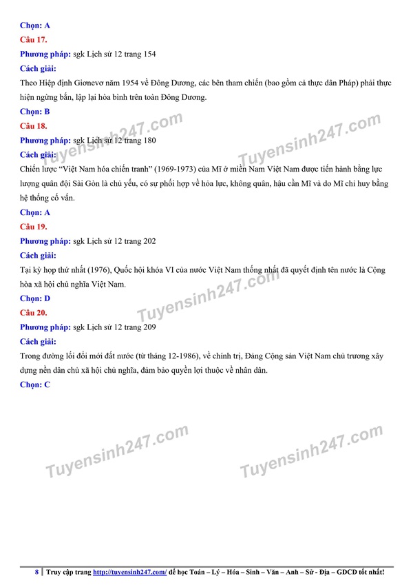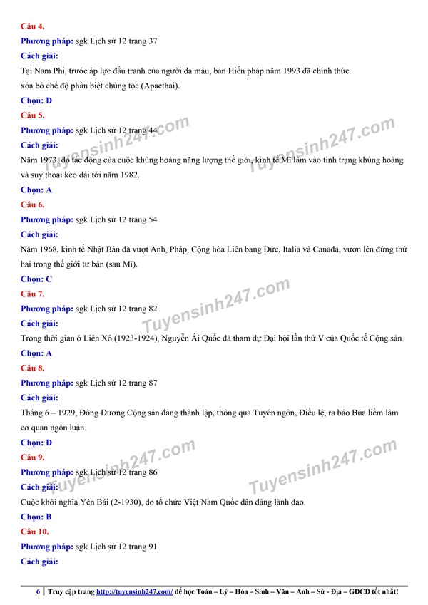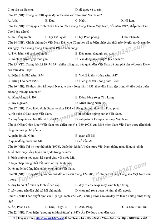 Dưới đây là gợi ý đáp án đề thi môn Lịch sử để các học sinh tham khảo (Nguồn: Tuyensinh247):