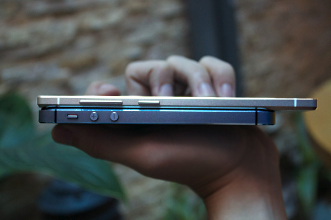 | Với thiết kế siêu mỏng chỉ 5.5mm tương đương (0,22 inch), người dùng có thể dễ dàng chạm ngón cái tới các cạnh bên kia của máy. |
