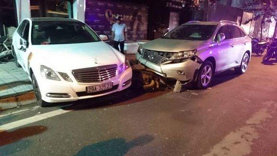 Tại hiện trường, chiếc Mercedes nằm chắn ngang vỉa hè, ngay trước cửa quán bar trên đường Trần Quang Khải. Chiếc xe tay ga bị hư hỏng nằm kẹt ở giữa 2 xe chiếc Mecerdes và Lexus RX350. Ngoài ra, xe Lexus RX350 bị hư hỏng phần đầu sau tai nạn.