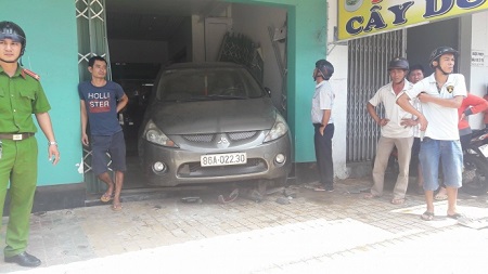 Riêng ô tô chưa dừng lại ở đó tiếp tục lùi nhanh và tông sập cửa sắt, chui lọt vào căn nhà số 413 ở lề đối diện, đến khi đụng vách tường mới dừng.