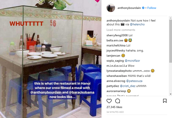 Mới đây, quán bún chả Hương Liên – nơi ông Obama và đầu bếp riêng Anthony Bourdain từng ghé lại trong chuyến đi, đã đóng khung kính bộ bàn ăn hai người từng sử dụng. Trước rất nhiều tranh cãi về việc làm này, bà chủ quán cho biết chỉ “muốn lưu giữ kỷ niệm đẹp”.