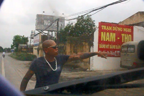 Một nam thanh niên bặm trợn, xăm trổ đầy mình, đầu trọc, đeo kính đen ngang nhiên chặn ngay đầu xe và giơ tay ra hiệu lệnh cho xe dừng lại, rẽ vào trạm dừng nghỉ mang tên “Nam Thọ” (thực chất là một quán của tư nhân).
