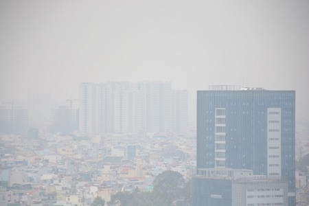 Nhìn từ một tòa nhà cao tầng trên đường Lê Đại Hành về hướng Nam, khu du lịch Đầm Sen vẫn chìm trong sương mù trắng đục. Các khu dân cư ở khu vực quận 5, Tân Bình, Tân Phú cũng trong tình trạng thời tiết tương tự.