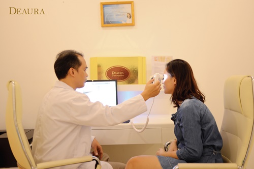 Các chuyên gia thẩm mỹ thăm khám da cho khách hàng. |