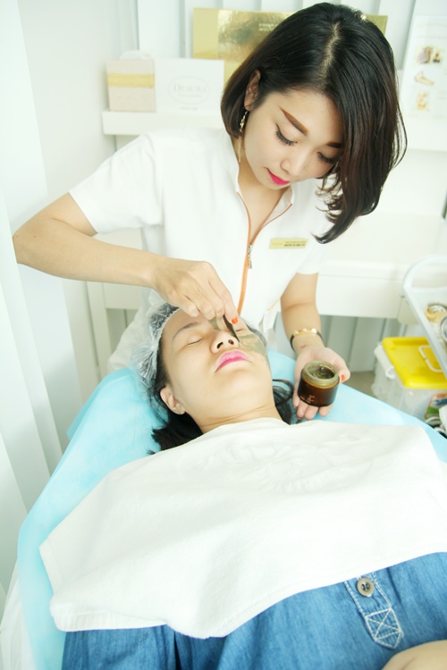 Chuyên gia thẩm mỹ trị liệu cho làn da của khách hàng bằng mỹ phẩm Deaura |