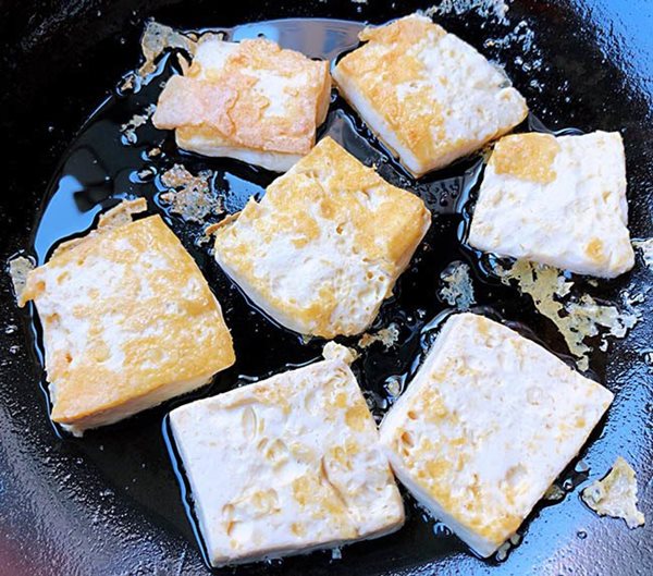 Đậu hũ cho vào chảo, chiên vàng 2 mặt.