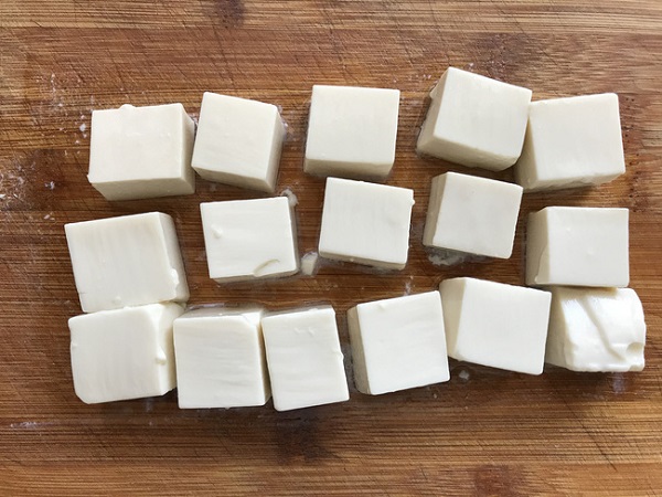 - Đậu phụ non đem cắt thành từng miếng vuông có kích thước 2cm.