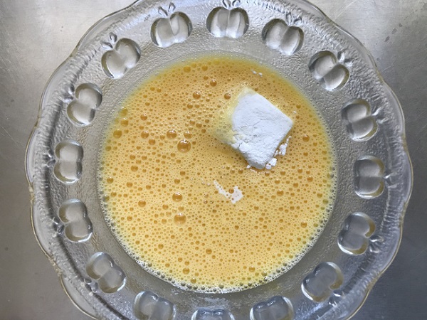 - Đánh tan trứng trong bát. Chuẩn bị sẵn 1 tô bột ngô, 1 tô bột chiên xù.