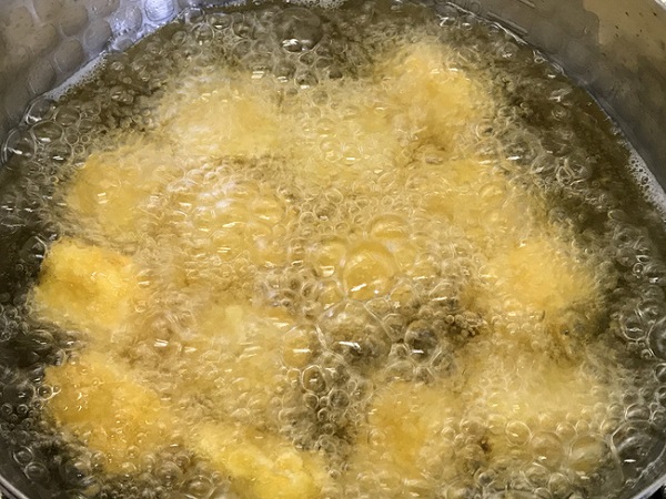 - Cho lượng dầu phù hợp vào chảo, đun sôi dầu rồi thả đậu vào chiên.