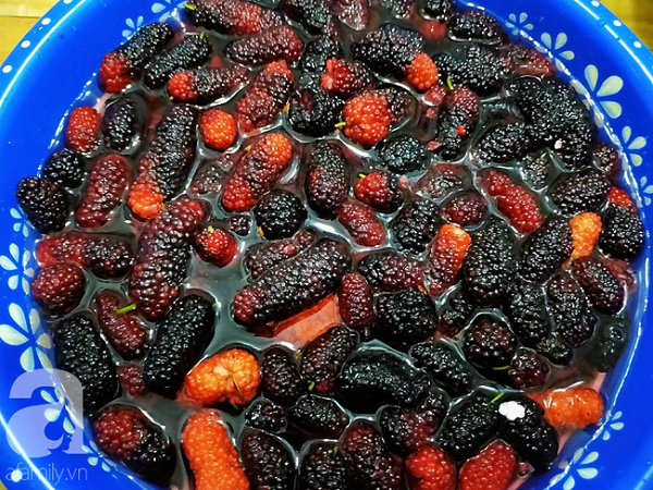 - Bước 1: Dâu tằm mua về thả vào chậu nước rửa nhẹ nhàng để hết bụi bẩn. Sau đó lấy một chậu nước lọc, thêm 2 thìa canh muối hòa tan rồi thả dâu tằm vào ngâm nước muối trong tầm 30 phút.