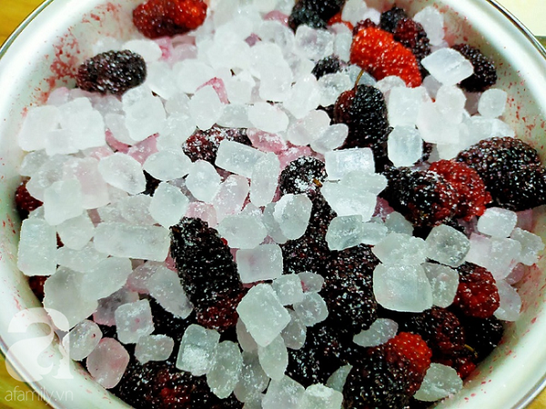 - Bước 4: Khi dâu đã khô ráo, cho dâu vào âu hoặc nồi sạch có nắp đậy, thêm đường phèn rồi xóc đều, đậy nắp kín, để nồi chỗ khô ráo, sạch sẽ qua đêm để đường tan.