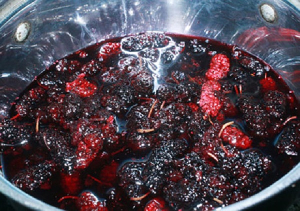 - Bước 7: Để nước siro thật nguội rồi cho vào lọ thủy tinh, bảo quản trong ngăn mát tủ lạnh sẽ để được rất lâu. Còn phần quả nếu muốn làm mứt dâu tằm thì chúng ta xay nhuyễn rồi sên bằng chảo chống dính đến khi có độ dẻo theo ý muốn là được.
