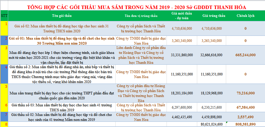 Theo tìm hiểu, thống kê 7 gói thầu mua sắm hàng hóa do Sở GD&ĐT tỉnh Thanh Hóa tổ chức đấu thầu năm 2019-2020, với vốn chi ngân sách 81.429.406.490 đồng. Sau đấu thầu, chỉ tiết kiệm cho ngân sách chưa đầy 1%. Cá biệt, nhiều gói thầu mua sắm trực tiếp có giá dự toán bằng giá trúng thầu.