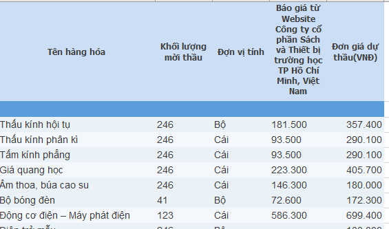 Hay tại “Gói thầu số 03: Mua sắm thiết bị dạy học cho học sinh 41 trường THCS năm 2019” tình trạng cũng diễn ra tương tự. Với danh mục 340 hạng mục mua sắm đều có xuất xứ từ Công ty cổ phần Sách và Thiết bị trường học TP Hồ Chí Minh – hàng Việt Nam. PV vào đúng website của nhà cung cấp này để lấy báo giá so sánh. Dường như, hiện tượng “đội giá” gói thầu đã trở thành hệ thống khi báo giá tại website: http://stb.com.vn/vi/ có những loại hàng hóa mua sắm thấp hơn rất nhiều so với giá trúng thầu của Công ty Thanh Hóa. Cụ thể, PV liệt kê một số hạng mục dưới đây.