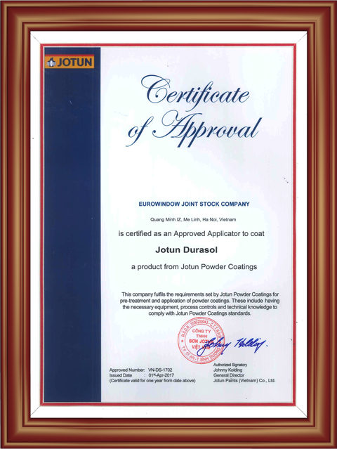 Năm 2015 Eurowindow đã được nhận chứng chỉ bảo hành 25 năm sơn tĩnh điện Jotun. Sau 2 năm kiểm nghiệm và đánh giá công nghệ dây chuyền sản xuất, năng lực vận hành máy móc, thiết bị, chất lượng sơn thành phẩm của Eurowindow. Để có được chứng nhận bảo hành 30 năm của Jotun, dây chuyền sơn phải đạt những tiêu chuẩn rất khắt khe của các tổ chức chứng nhận hàng đầu thế giới cụ thể: Sơn tĩnh điện Jotun Durasol đạt các tiêu chuẩn Châu Âu Qualicoat Class 3 - cấp cao nhất của Châu Âu (Qualicoat có trụ sở đặt tại Thụy Sĩ, là tổ chức hàng đầu thế giới về đo lường và kiểm định nghiêm ngặt chất lượng sơn/sơn phủ trên nhôm/ hợp kim nhôm cho các ứng dụng kiến trúc trên toàn cầu), tiêu chuẩn Mỹ AAMA 2605 - cấp cao nhất của Mỹ (AAMA - American Architectural Manufacturers Association, là một tổ chức toàn cầu, trụ sở đặt tại Hoa Kỳ, là Hiệp hội các nhà đầu tư kiến trúc Hoa Kỳ); quy trình kiểm soát chất lượng sản phẩm, phòng ngừa sai sót … theo quy định và hướng dẫn chi tiết của Jotun; hệ thống kiểm soát chất lượng sản phẩm, hệ thống thiết bị dây chuyền sơn, nhiệt độ sấy của Eurowindow đảm bảo tiêu chuẩn để sơn sản phẩm Jotun; các mẫu sơn thực tế được kiểm tra bởi phòng Lab Jotun tại Thailand đánh giá test mẫu trực tiếp (ví dụ Phun muối, chịu ẩm 4000 giờ….). Trải qua giai đoạn kiểm nghiệm khắt khe, Eurowindow đạt được tất cả các tiêu chí khắt khe của Jotun chính vì vậy năm 2017 Jotun đã quyết định trao giấy chứng nhận bảo hành trong vòng 30 năm trên toàn cầu cho Eurowindow.