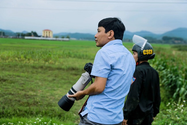 Nhà báo Phan Xuân Hồng sử dụng máy ảnh ống zoom cực đại để ghi hình nhóm đối tượng từ xa. |