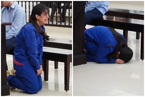 Nữ bị cáo bật khóc quỳ gối xin lỗi mẹ. Ảnh: Saostar |