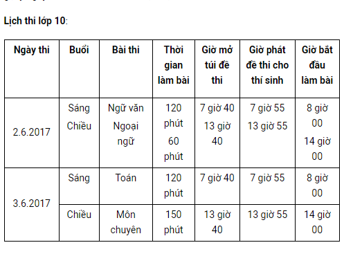 Các thí sinh sẽ làm bài thi tại 125 điểm thi, trong đó có 115 điểm thi vào lớp 10 thường, 10 điểm thi vào lớp 10 chuyên. Buổi sáng chính thức làm bài vào lúc 8h và buổi chiều là 14h.