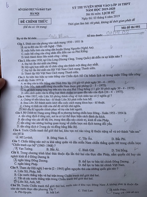Đề thi môn Lịch Sử vào lớp 10 tại TP. Hà Nội. |