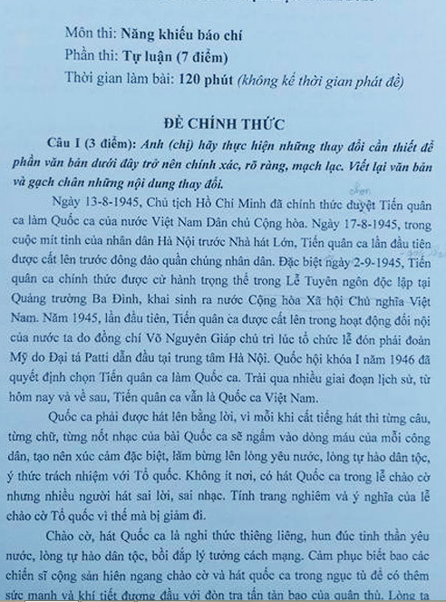 Bài thi năng khiếu báo chí gồm có 2 phần thi trắc nghiệm và tự luận, tổng thời gian làm bài 150 phút. Lãnh đạo Học viện cho biết, với bài thi này, thí sinh sẽ được chứng tỏ năng lực, tố chất sáng tạo của nhà báo.