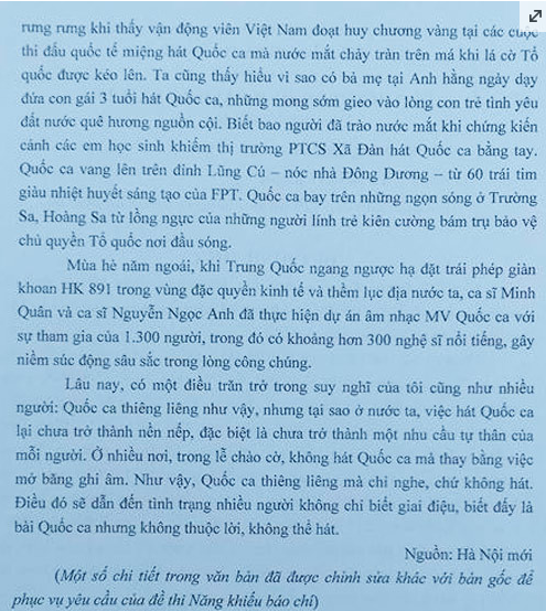 Kết thúc buổi thi, các thí sinh đều rất hào hứng với cách ra đề mở của môn thi này. Nhất là bài hát “Tiến quân ca” được đưa vào đề thi làm cho thí sinh cảm thấy thú vị. Đa phần thí sinh đánh giá dù đề thi chỉ yêu cầu chỉnh sửa đoạn văn nói về Quốc ca nhưng thực sự thí sinh phải có vốn hiểu biết về lịch sử, khả năng diễn đạt và hơn hết là tình cảm yêu mến bài hát này thì mới có thể làm tốt được.