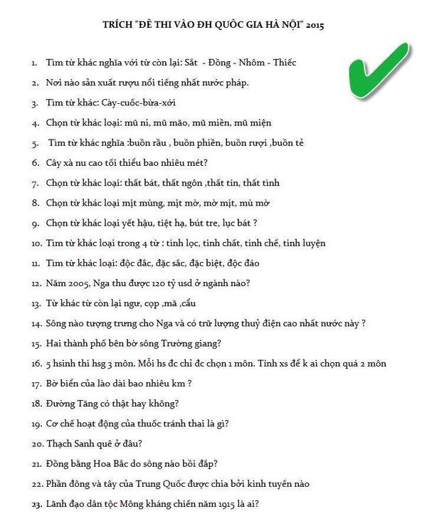 Các thông tin được ghi là “Trích đề thi vào Đại học Quốc gia Hà Nội năm 2015” mà nhiều trang báo điện tử, mạng xã hội đưa là không có thật, không có trong bộ đề thi đánh giá năng lực phục vụ tuyển sinh đại học chính quy vào Đại học Quốc gia Hà Nội năm 2015.