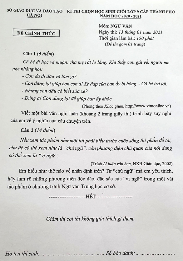 Mới đây, mạng xã hội lại xôn xao chia sẻ đề thi chọn học sinh giỏi lớp 9 môn Ngữ Văn ở Hà Nội ngày 13/1 vừa qua.