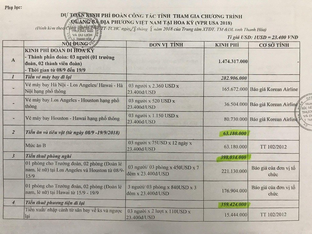 Chương trình mà tỉnh Thanh Hóa thực hiện xúc tiến, quảng bá trên đất nước Hoa Kỳ được thực hiện tại 2 địa phương là Los Angeles và Hawaii. Tổng kinh phí dự toán cho toàn bộ chuyến đi là gần 1,7 tỷ đồng. Bảng kê các chương trình đi cho thấy tổng số tiền cho 3 người đi hết gần 1,5 tỷ đồng, số tiền còn lại là kinh phí in tài liệu và quà tặng phẩm. Cụ thể, tiền thuê phòng nghỉ: 398 triệu đồng (3 người ở 3 phòng; tại Los Angeles giá phòng là 450 USD/phòng, Hawaii là 840 USD/phòng); tiền thuê phương tiện đi lại 359,424 triệu đồng; chi các buổi làm việc 370,773 triệu đồng; thuê phiên dịch tiếng Anh gần 108 triệu đồng…