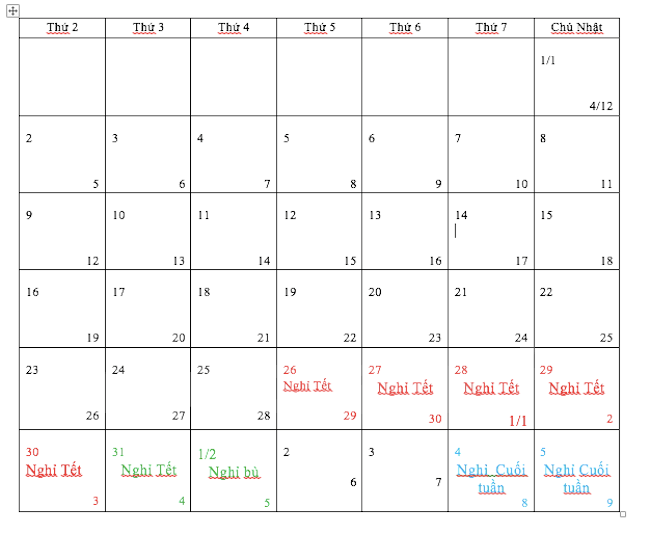Do mùng 1, mùng 2 Tết Âm lịch rơi vào hai ngày cuối tuần, công chức được nghỉ bù vào mùng 4, mùng 5 Tết. Tổng cộng có 7 ngày nghỉ và không hoán đổi.