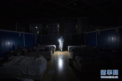 Bác sĩ Hồ Bội, thành viên của đội ngũ y tế hỗ trợ đến từ Giang Tây đang đi kiểm tra các buồng bệnh trong ca trực đêm cuối cùng tại bệnh viện Vũ Xương. Ảnh: Tân Hoa Xã |