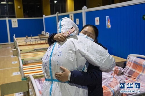 Một nữ bệnh nhân nhiễm Covid-19 được chữa khỏi ôm tạm biệt nữ y tá Tào Tĩnh Lỗi đến từ bệnh viện Hoa Sơn, bệnh viện Phúc Đán Thượng Hải. Ảnh: Tân Hoa Xã |