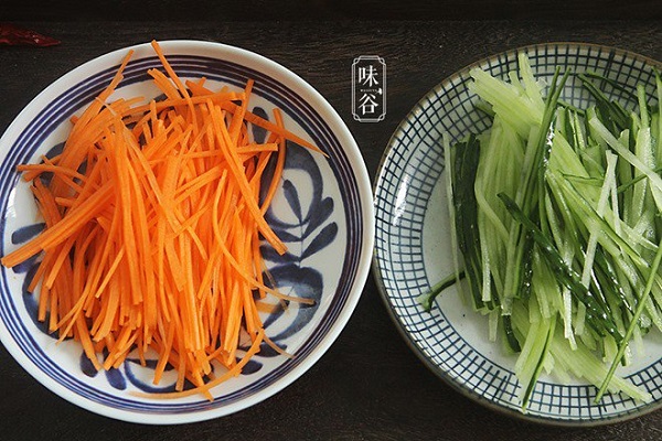 - Rửa sạch dưa chuột và cà rốt, cà rốt bào vỏ sau đó thái sợ tất cả.
