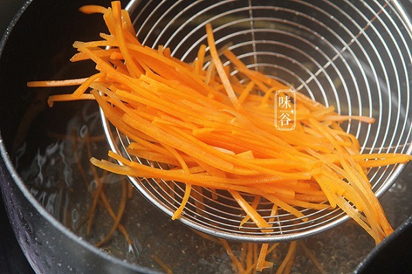 - Bắc một nồi nước sôi, đem cà rốt chần khoảng 10 giây.