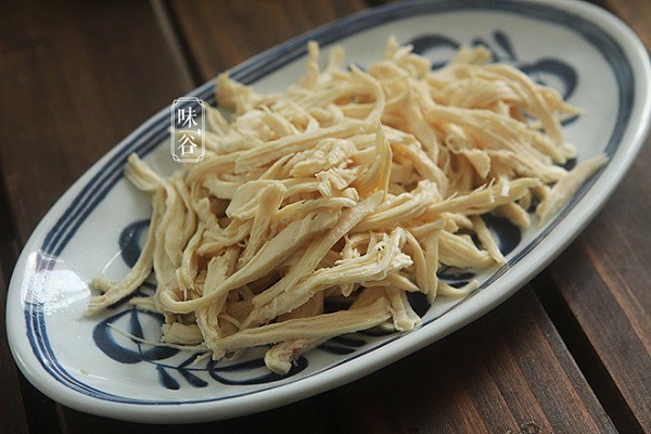 - Cho ức vào nồi vối nước, thêm vào 1 thìa rượu nấu ăn, hành lá, gừng, sau đó đun sôi khoảng 10 - 15 phút. Kiểm tra thịt bằng cách dùng đũa đâm vào, nếu dễ dàng đâm xuyên qua là chín. Vớt ra để nguội rồi xé xợi thịt gà.