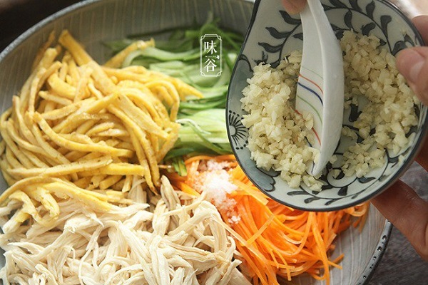 - Cho cà rốt, dưa chuột, thịt gà, trứng, tỏi băm vào trong một bát to, trộn đều.
