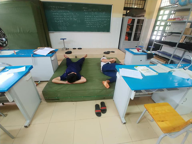 Hai nam sinh trải nệm ngủ luôn trong lớp để tiện ôn thi. |
